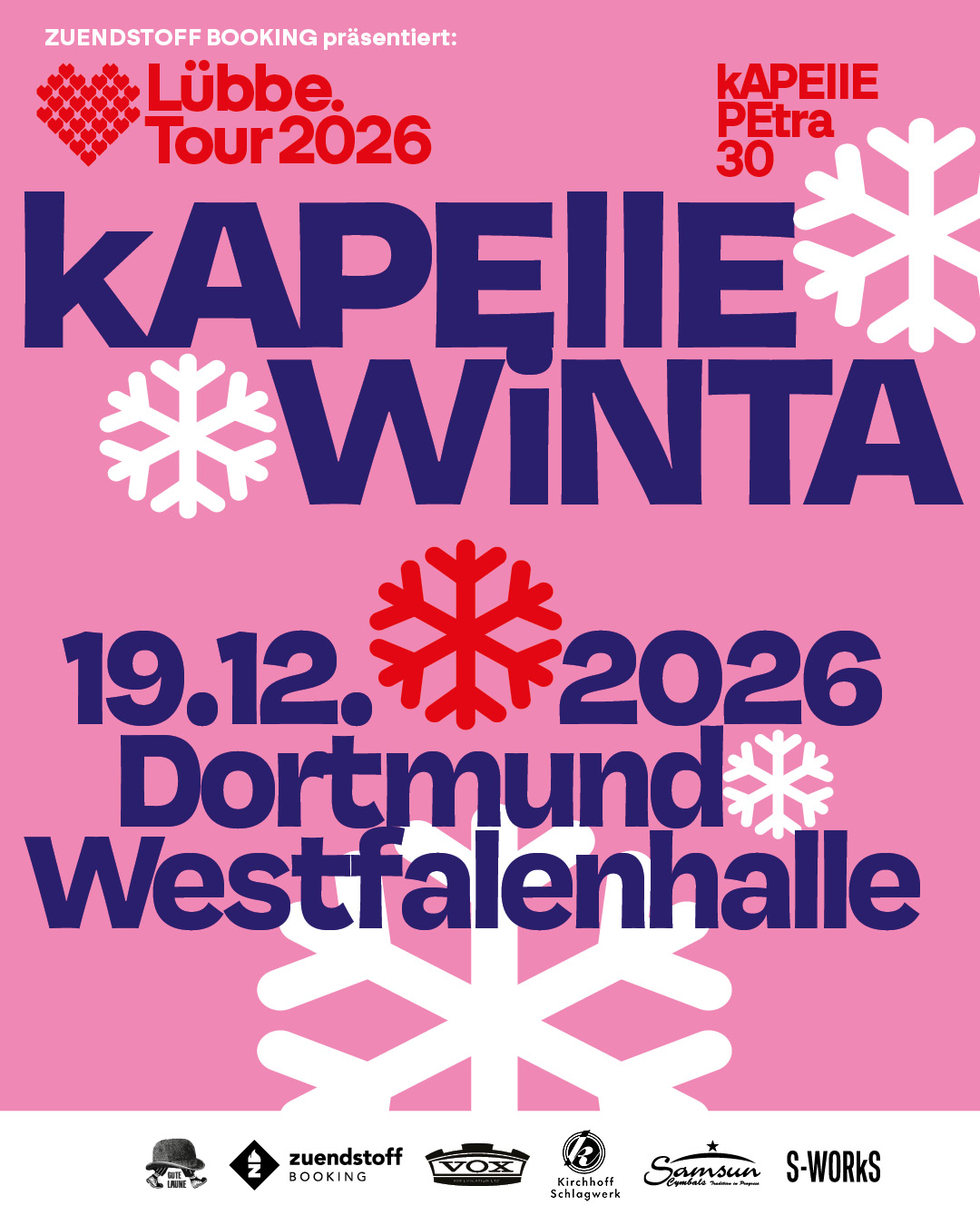 Drei Jahrzehnte Kapelle Petra – das muss ordentlich gefeiert werden! Im Jahr 2026 lädt die Indie-Rock-Institution aus Hamm zur großen LÜBBE Tour und macht ihr Jubiläum zu einem Ereignis, das Fans und Musikliebhaber nicht verpassen dürfen. Die Band um „Opa“, „Der tägliche Siepe“, „Ficken Schmidt“ und natürlich ihre lebende Bühnenskulptur „Gazelle“, feiert 30 Jahre Bühnenleben mit einer Tour, die so exklusiv ist wie nie zuvor: Alle jetzt veröffentlichten Termine sind die einzigen Kapelle Petra Headliner Konzerte im Jubiläumsjahr – weitere wird es 2026 definitiv nicht geben. Mit der LÜBBE Tour schlägt Kapelle Petra ein neues Kapitel auf: Neben altbekannten Lieblingsorten stehen erstmals ganz neue Locations auf dem Tourplan. Das Jubiläumsjahr verspricht zudem besondere Überraschungen, die das Live-Erlebnis einzigartig machen. Wer die Band kennt, weiß: Hier wird nicht einfach ein Best-of-Programm abgespult. Kapelle Petra präsentieren auf der LÜBBE Tour das Beste aus 30 Jahren Bandgeschichte – handverlesen, überraschend und mit der gewohnt charmanten Mischung aus Pop, Indie-Rock und augenzwinkernder Melancholie.