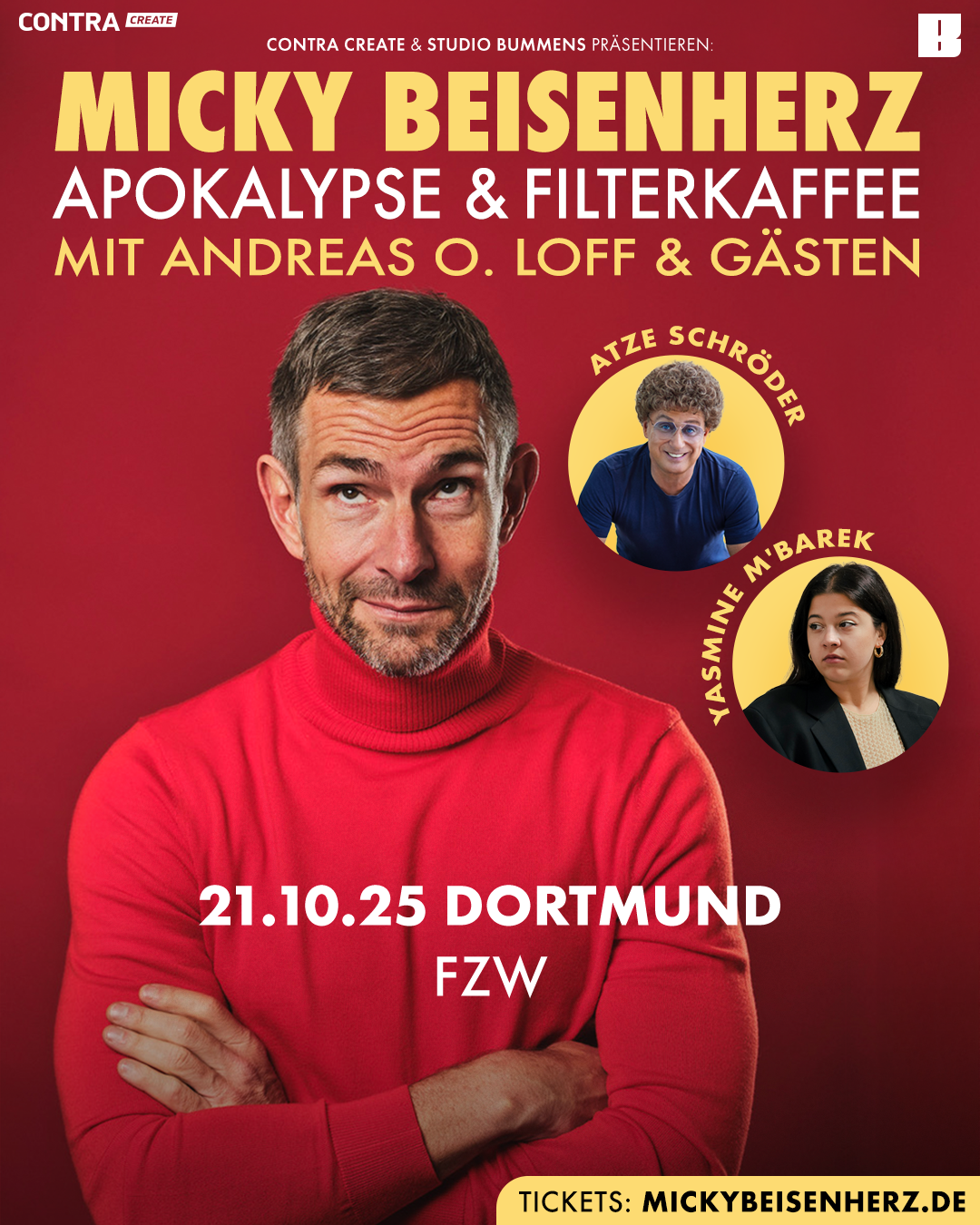 Im Herbst 2025 bringt er das erfolgreiche Format gemeinsam mit Podcast-Kollege Andreas Loff wieder auf die Bühne und wird mit diversen Talk-Gästen eine Live-Folge „Apokalypse & Filterkaffee“ im Late-Night-Charakter präsentieren. Gleich in mehreren Städten werden u.a. Yasmine M’Barek & Markus Feldenkirchen zu Gast sein, die mittlerweile fester Bestandteil der “Apokalypse & Filterkaffee”-Familie sind. Außerdem kann sich das Publikum auf weitere wechselnde Gäste, wie Fidi Oetker und andere bekannte Personen aus dem Erfolgsformat freuen.