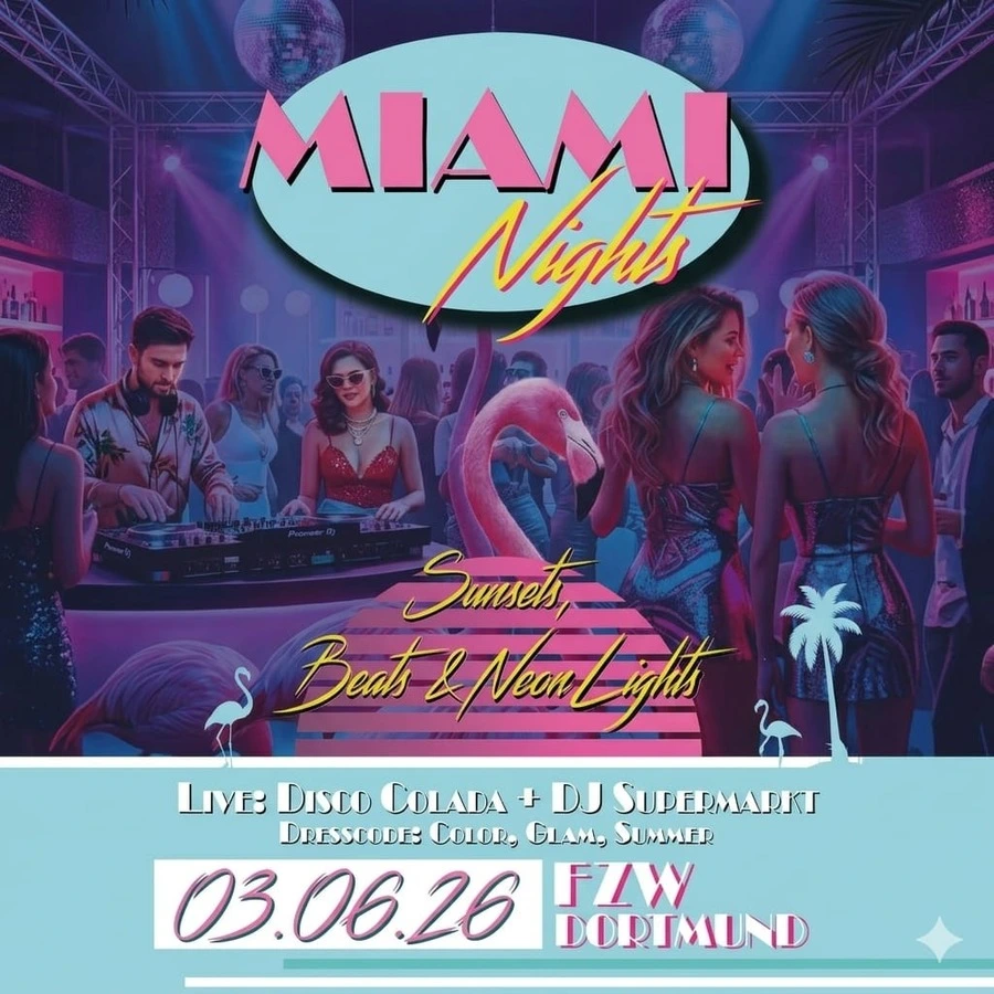 MIAMI LANDET IN DORTMUND. Wir holen den unverschämten Glamour der 80er Jahre direkt ins Herz des Ruhrgebiets. MIAMI NIGHTS ist mehr als eine Party – es ist eine Flucht aus dem Alltag in eine Welt aus Neon, Seide und dem Rauschen der Palmen. An den Decks kuratiert für euch die Crème de la Crème der… MIAMI NIGHTS weiterlesen