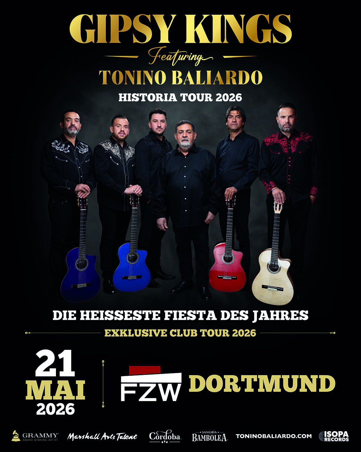 Bamboleo. Volare. Djobi Djoba. Baila Me. Die legendären Welthits – live und so nah wie seit Jahren nicht mehr. Mit der Historia Tour 2026 setzen die Gipsy Kings ein besonderes Zeichen: Zum ersten Mal präsentiert die Band eine einmalige Club- & Hallentour in handverlesenen Venues – geschaffen für die heißeste Fiesta des Jahres. Begleitet wird… Gipsy Kings feat Tonino Baliardo – Historia Club Tour 26 weiterlesen