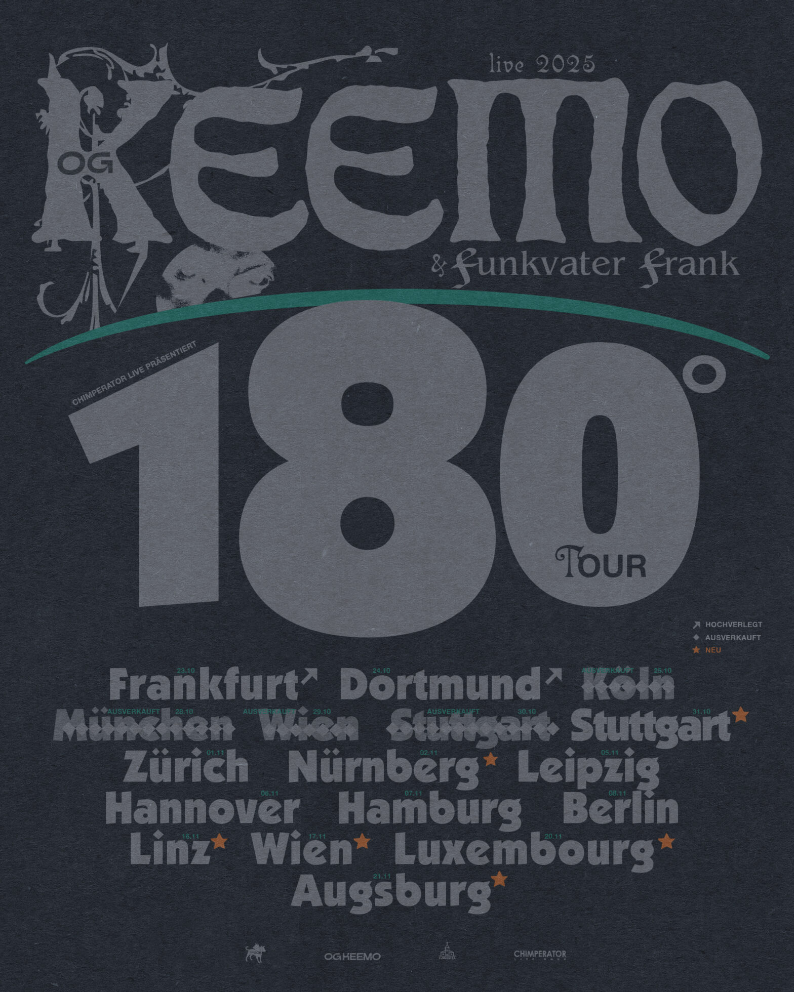 OG Keemo und Funkvater Frank haben verändert, wie Rap in Deutschland klingt. Mehr noch: Sie haben verändert, wie wir über Rap denken. Sie sind Straße und Kunst. Sie haben die Vergangenheit studiert und denken in der Zukunft. Sie dokumentieren den Dreck und glauben an das Licht. Dass das funktioniert, zeigt sich in der Vergangenheit nicht nur durch das Nummer 1 Album „Fieber“, das fünf Wochen den wohlverdienten Platz hält. Sondern auch durch eine restlos ausverkaufte „Stunden vor dem Fieber“-Tour 2023 und einem schnellen Sold-Out des „Süd:Süd Fest“ von OG Keemo & Friends im Sommer 2024 mit 5000 Besuchenden.