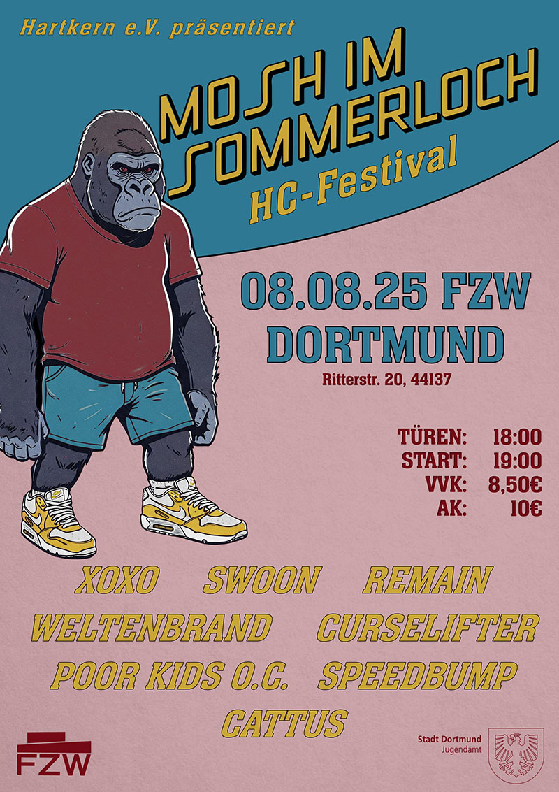Hartkern trifft FZW geht in die zweite Runde. Diesmal bei sommerlichen Temperaturen im August! Beim „SOMMER, SONNE, MOND UND KERNE“ gibt’s musikalisch was auf’s Fressbrett. Um die Tradition nicht zu brechen, beschallen wir euch auch mit ruhigen Klängen. Wie gewohnt auf zwei Bühnen im fliegenden Wechsel! Falls ihr nach acht Musikgruppen noch stehen könnt, dürft ihr danach noch zu elektronischen Klängen abzappeln.