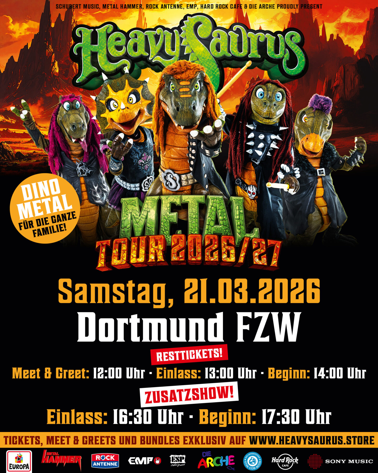 Achtung! Die erste Show mit Beginn um 14.00 Uhr ist schon fast ausverkauft! Deswegen wird es eine Zusatzshow geben! Einlass 16.30 Uhr und Beginn um 17.30 Uhr Alle Tickets, Meet… HEAVYSAURUS – METAL Tour 2026 weiterlesen